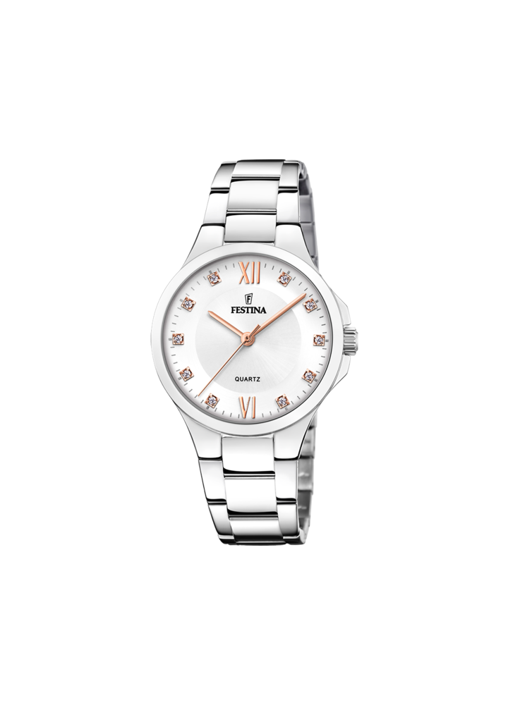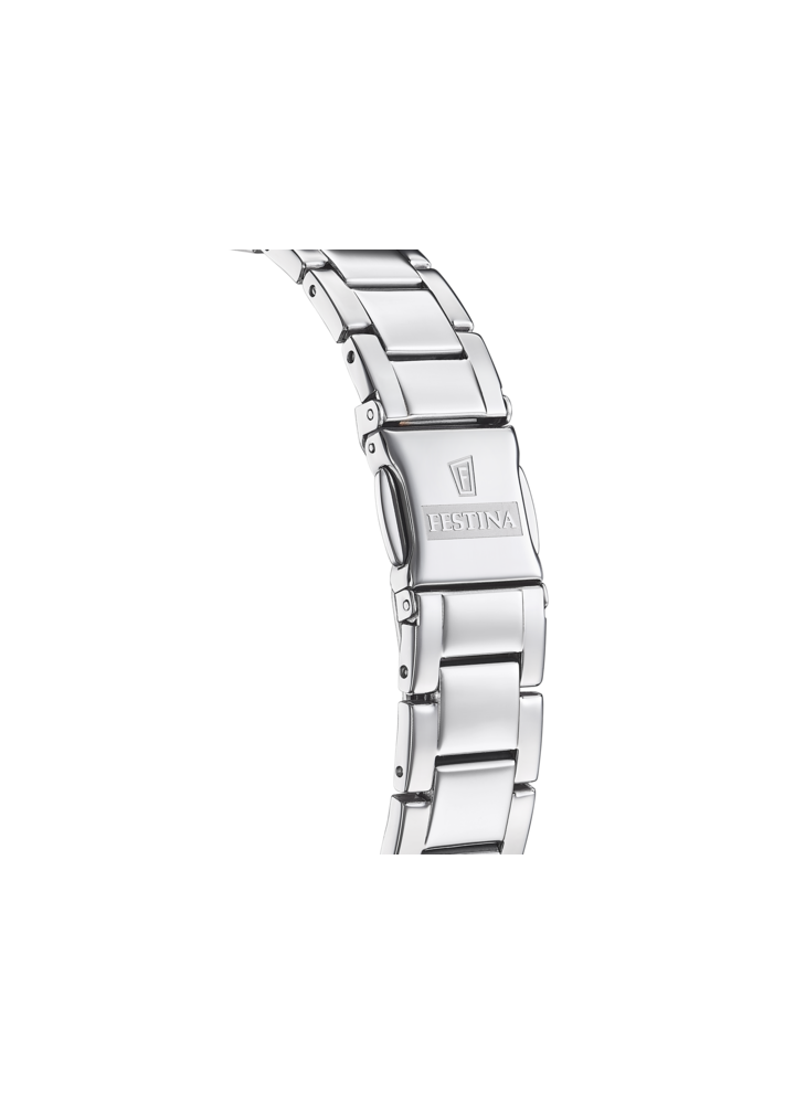 Orologio Festina da donna con cassa in acciaio e vetro minéral, dotato di bracciale in acciaio.