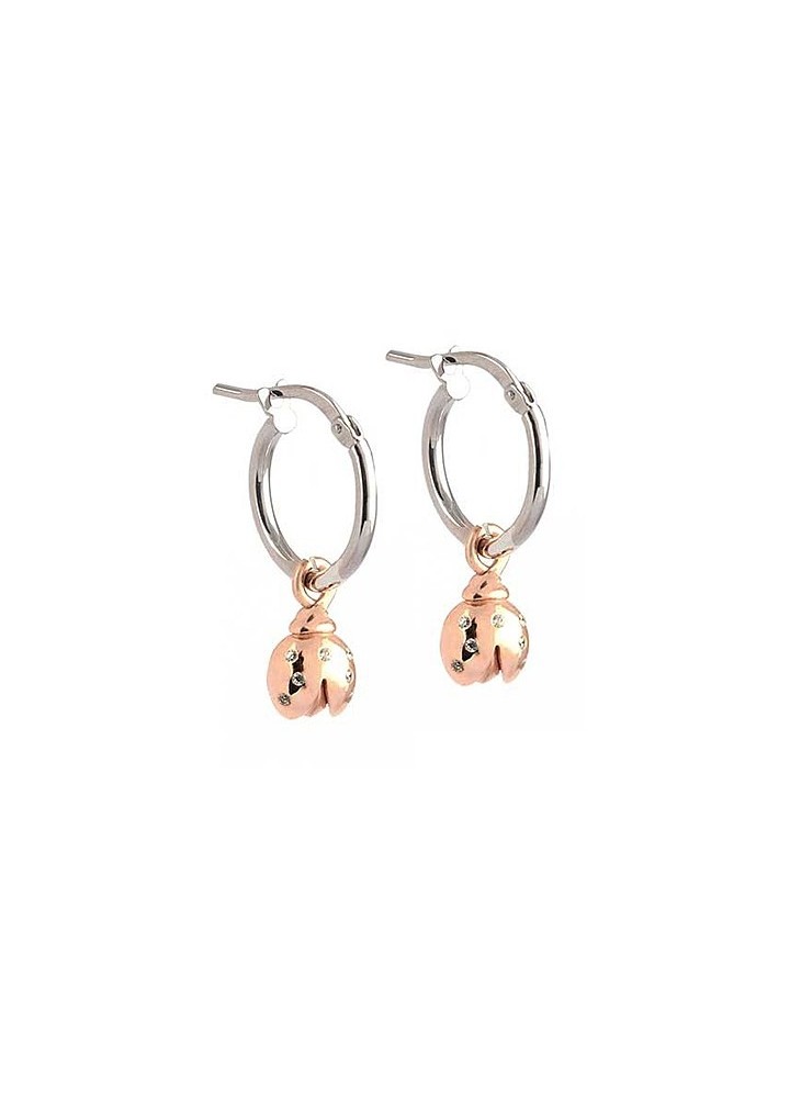 Orecchini creoli, Coccinelle placcate oro rosa con punti luce. Diametro 10 mm. Argento 925 Made in Italy.