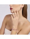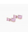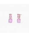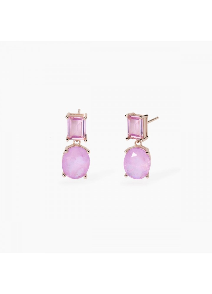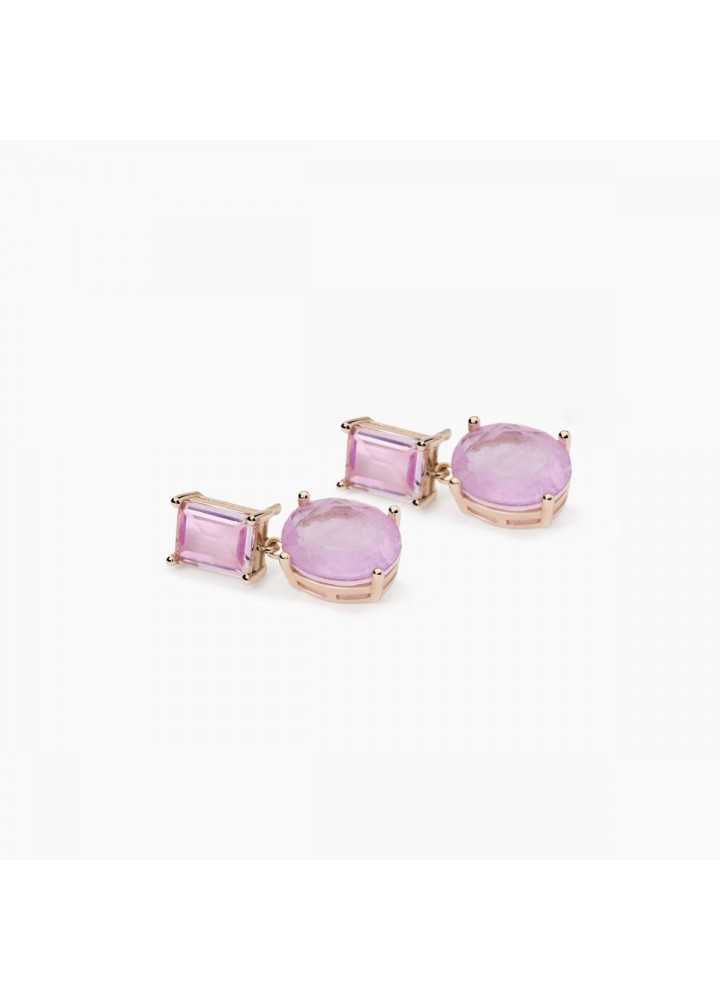 Orecchini da donna in argento placcato oro rosa con glass rosa taglio baguette, pendente in fusion stone di glass rosa e cristallo di rocca taglio ovale.