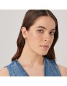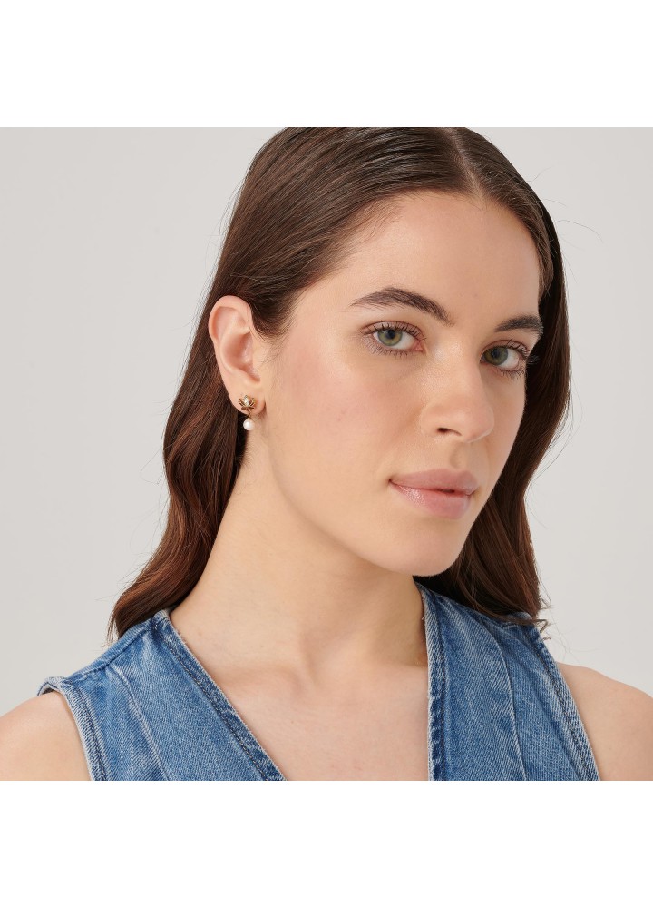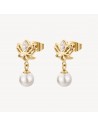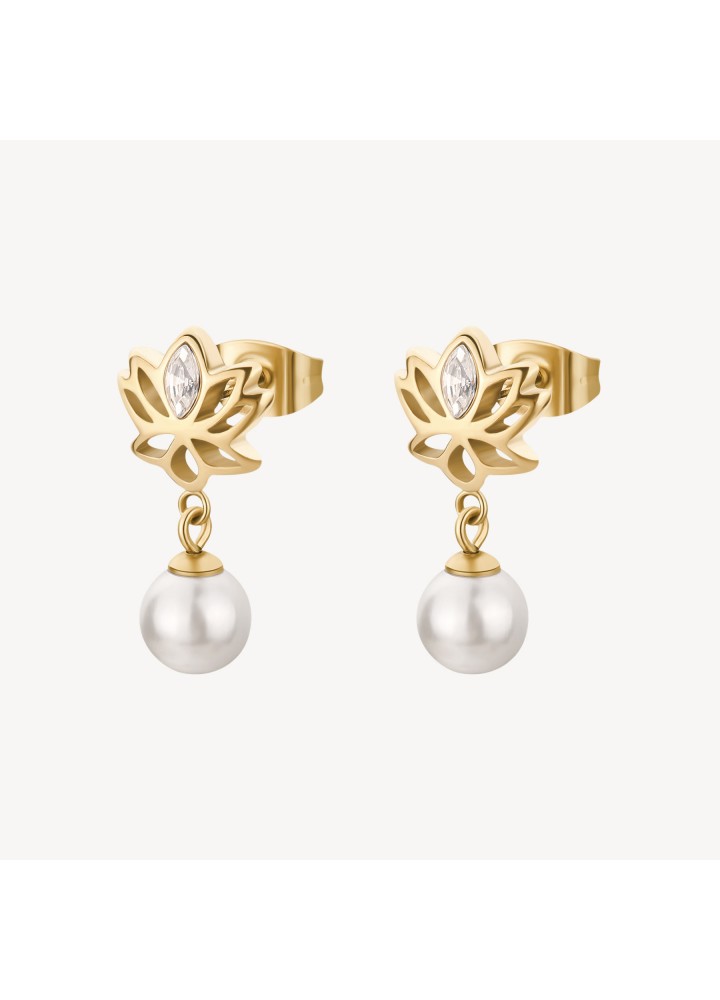 Orecchini in acciaio 316L e finitura pvd oro 14K a forma di fiore di loto, con perle di conchiglia e cristalli.
