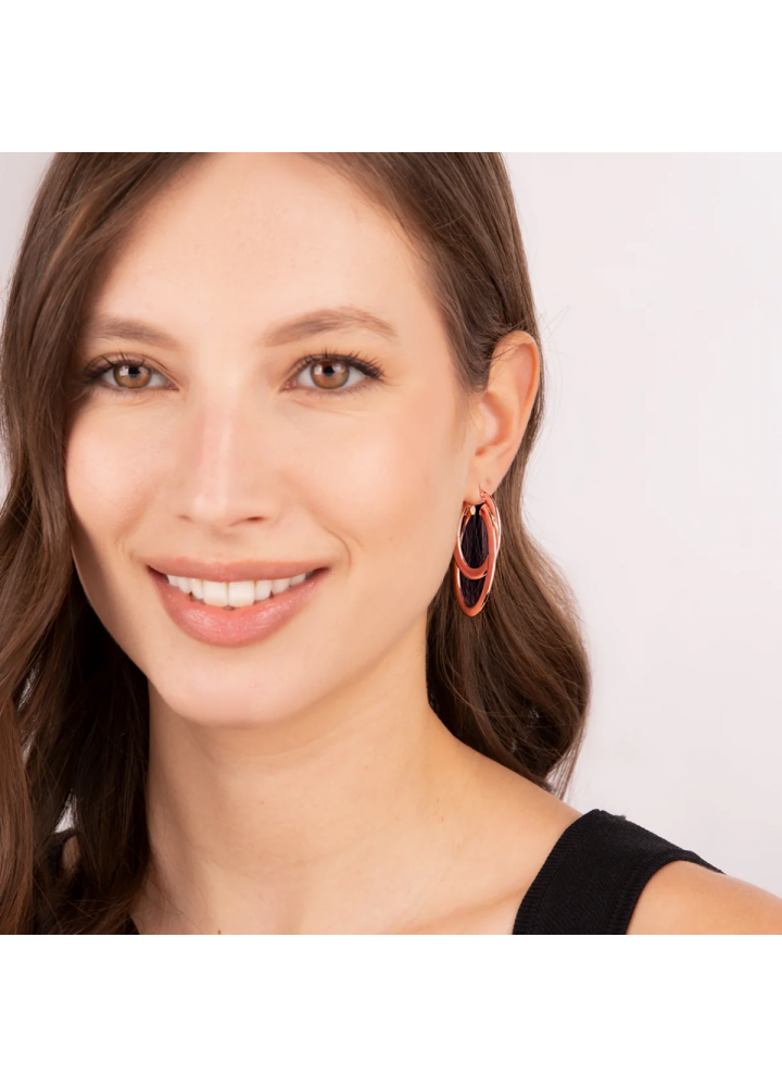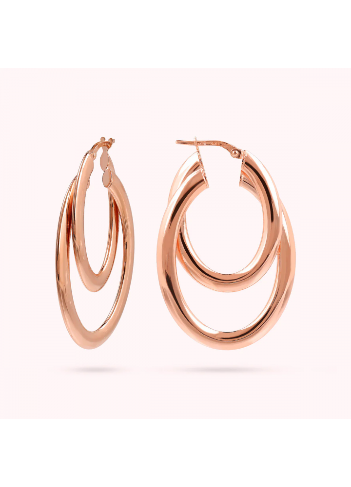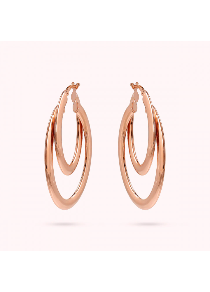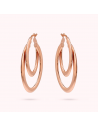 Orecchini pendenti a cerchio Bronzallure realizzati in lega Golden Rosé, placcati oro rosa 18kt, con doppio cerchio graduato; chiusura a baionetta. Dimensioni: 40x28 mm.