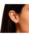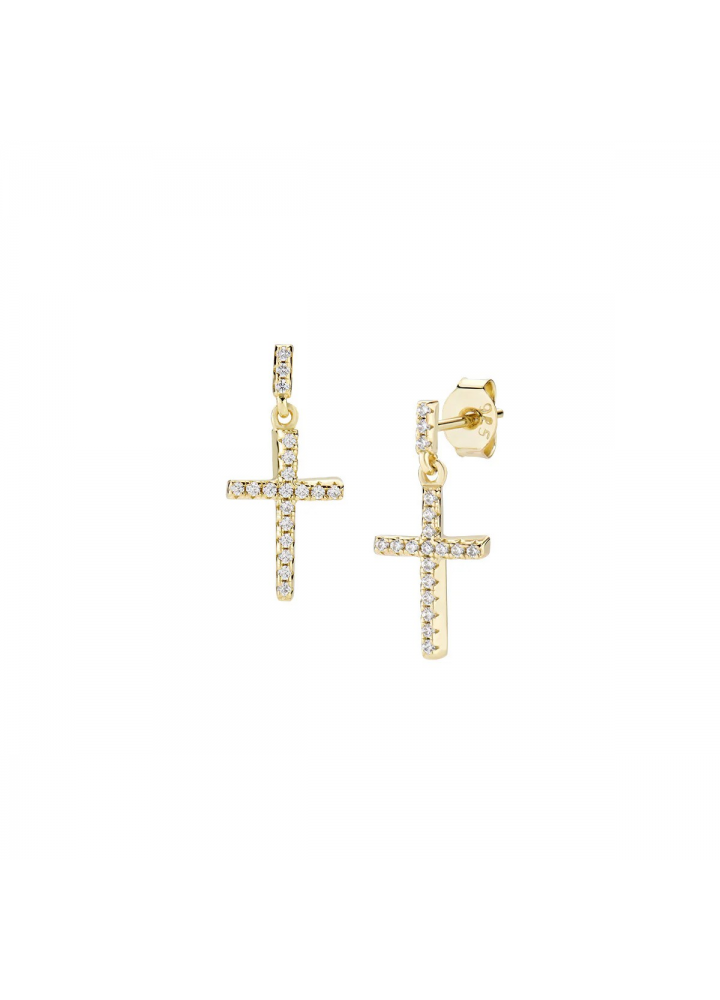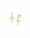 Orecchini in argento 925 dorato e zirconi bianchi con barretta e piccola croce pendente di 1,2 cm. Chiusura a farfallina.