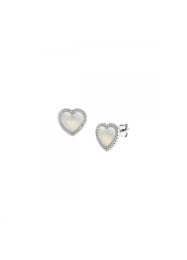Orecchini a lobo in argento 925 rodiato a forma di cuore con madreperla centrale e bordo di zirconi bianchi. Chiusura a farfallina. Dimensioni 7 x 7 mm.