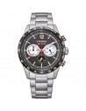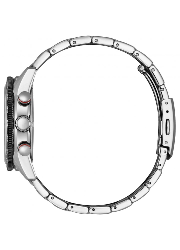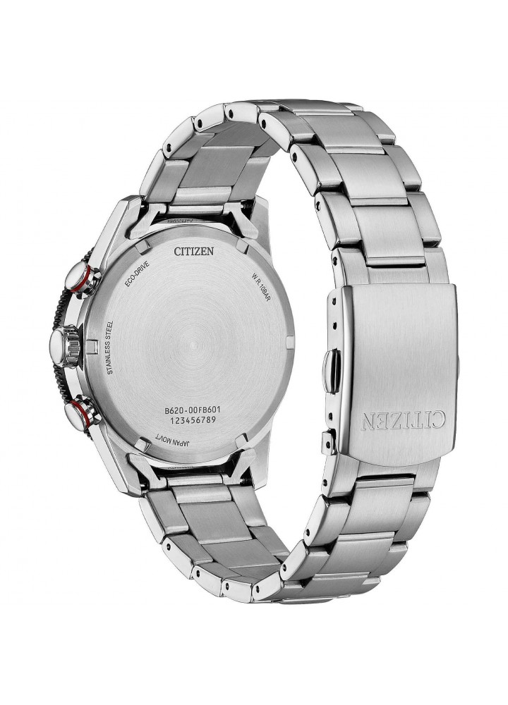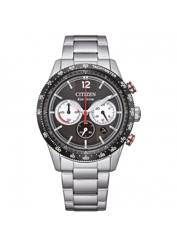 Orologio di Citizen della collezione OF Collection 2026. Orologio cronografo eco drive da uomo con cassa in acciaio con fondello serrato a vite e diametro di 39 mm; quadrante nero con indici applicati e vetro minerale. Bracciale in acciaio con chiusura a pulsante. Resistenza all’acqua di 10 ATM e movimento eco drive calibro B620 con riserva di carica fino a 7 mesi