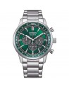 Orologio di Citizen della collezione OF Collection 2026. Orologio cronografo eco drive da uomo con cassa in acciaio con fondello serrato a vite e diametro di 39 mm; quadrante verde con indici applicati e vetro minerale. Bracciale in acciaio con chiusura a pulsante. Resistenza all’acqua di 10 ATM e movimento eco drive calibro B620 con riserva di carica fino a 7 mesi