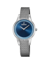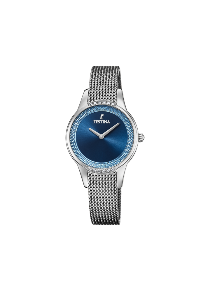 Orologio Festina da donna con cassa in acciaio, zirconi e cristallo minerale, quadrante di colore blu e cinturino in acciaio inox 316L in Maglia Milano color grigio argento. Movimento al quarzo analogico. Resistenza all'acqua di 5 ATM. Diametro della cassa 30.2 mm. Dimensione del cinturino 11.95 mm. Referenza F20494/2