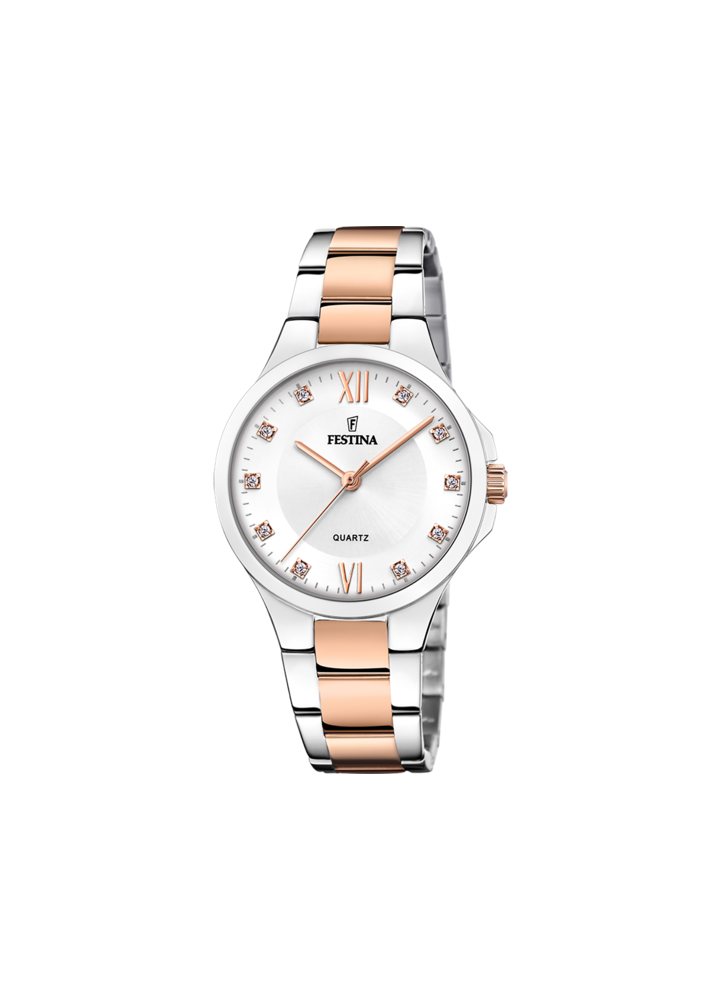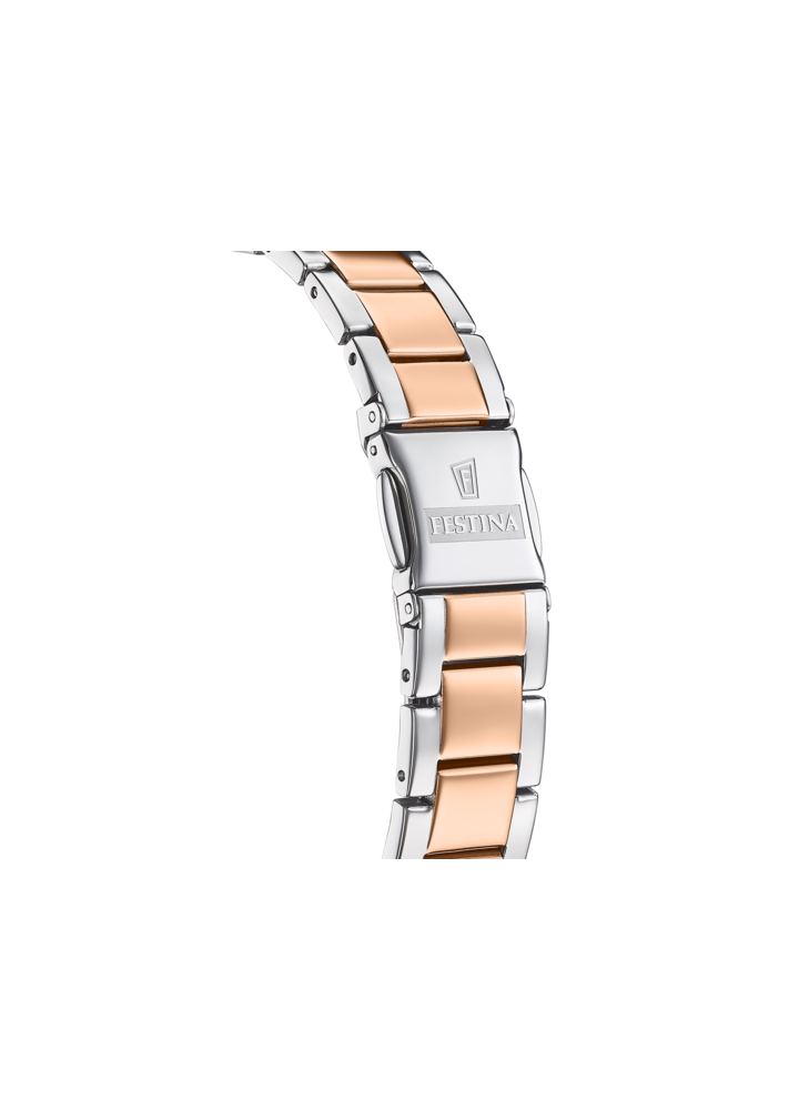 Orologio Festina da donna con cassa in acciaio e vetro minéral, dotato di cinturino bicolore in acciaio.