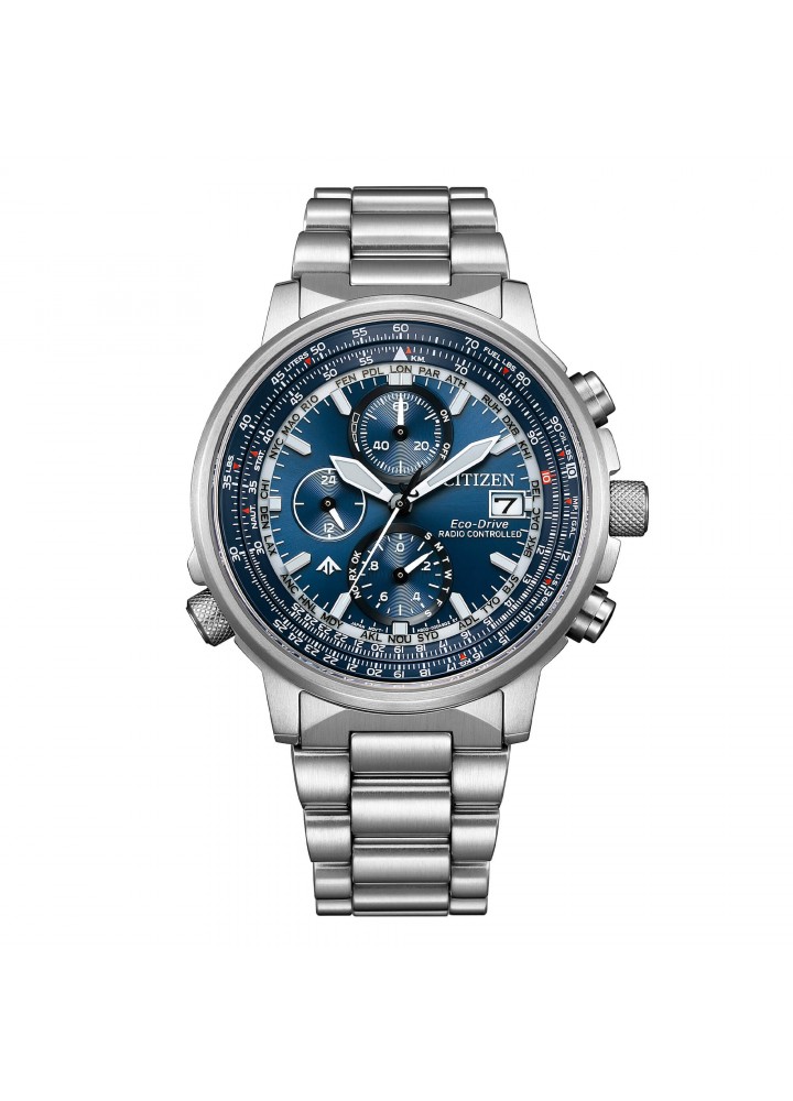 Movimento Eco-Drive a carica luce con riserva di carica di 10 mesi e indicatore livello di carica sul quadrante. Caratteristiche Cassa in acciaio con regolo calcolatore di tipo aereonautico, bracciale in acciaio. Vetro zaffiro. WR 20 bar. Funzioni Radiocontrollato a 5 canali: ricezione segnale orario USA, Europa, Giappone, Cina. World time con orario di 26 città del mondo e ora UTC. Cronografo a 1/20 di sec. Calendario perpetuo. Dimensioni Diametro cassa 41 mm
