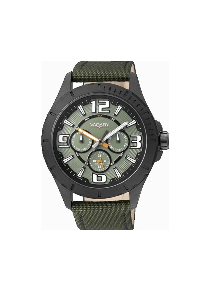orologio maschile Vagary bY Citizen VH0-741-40 -movimento al quarzo multifunzione, cassa da 44mm in acciaio, cinturino in cordura, quadrante verde, fondello serrato a vite,WR 100 metri.