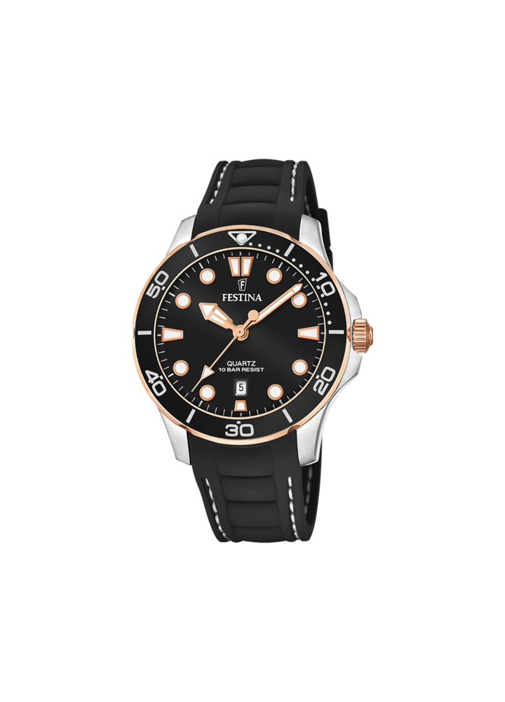 Orologio Festina da donna con cassa in acciaio inox 316L e cristallo minerale, quadrante di colore nero e cinturino in gomma nero. Resistenza all'acqua di 10 ATM. Diametro della cassa 38.5 mm. Dimensione del cinturino 19 mm. Referenza F20502/6