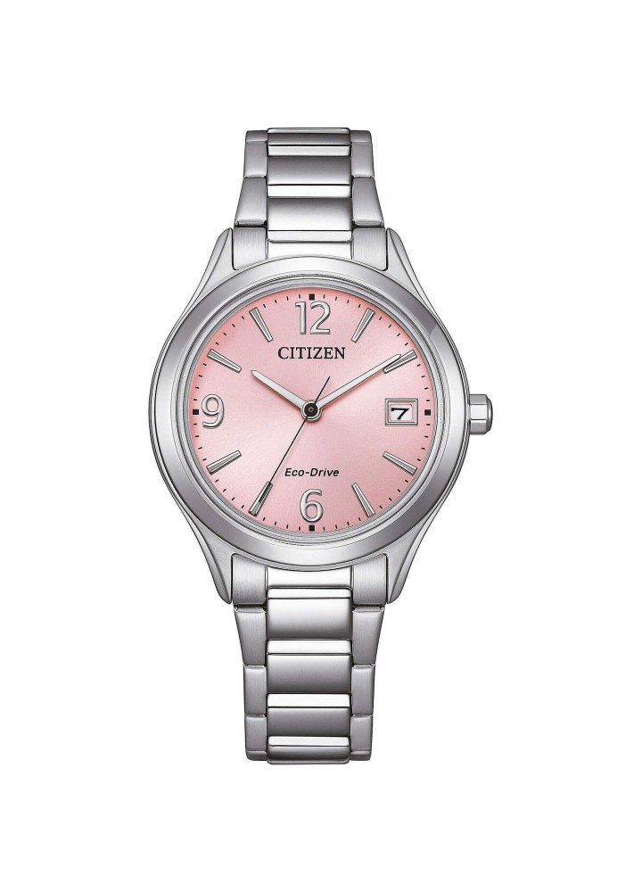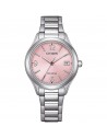 Orologio di Citizen della collezione OF Collection 2026. Orologio eco drive da donna con cassa in acciaio e diametro di 33,5 mm; quadrante rosa con indici applicati e vetro minerale. Bracciale in acciaio con chiusura a pulsante. Resistenza all’acqua di 5 ATM e movimento eco drive con riserva di carica fino a 8 mesi.