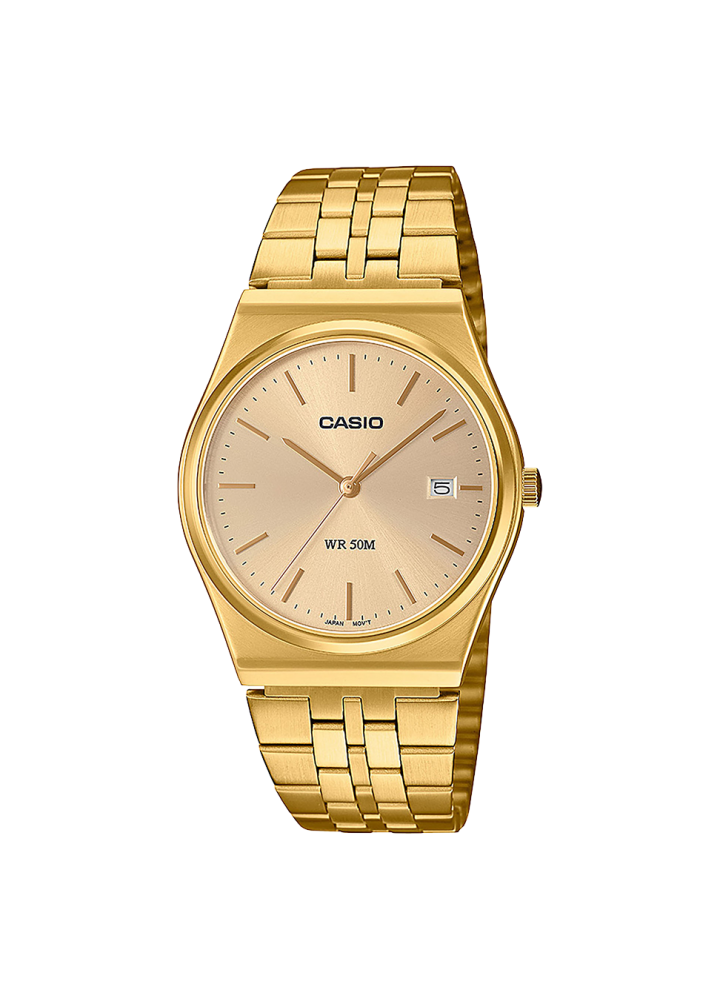 Orologio da uomo del brand Casio. Date display, vetro minerale, Robusta cassa in acciaio inox placcato oro, bracciale in acciaio inox placcato oro, Chiusura di sicurezza, 3 anni - 1 batteria, Classificazione di impermeabilità (5 bar)