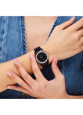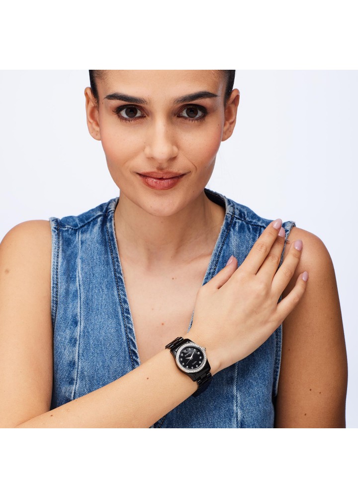 Orologio solo tempo in acciaio 304 con quadrante copper nero e cristalli, con cinturino in policarbonato nero.