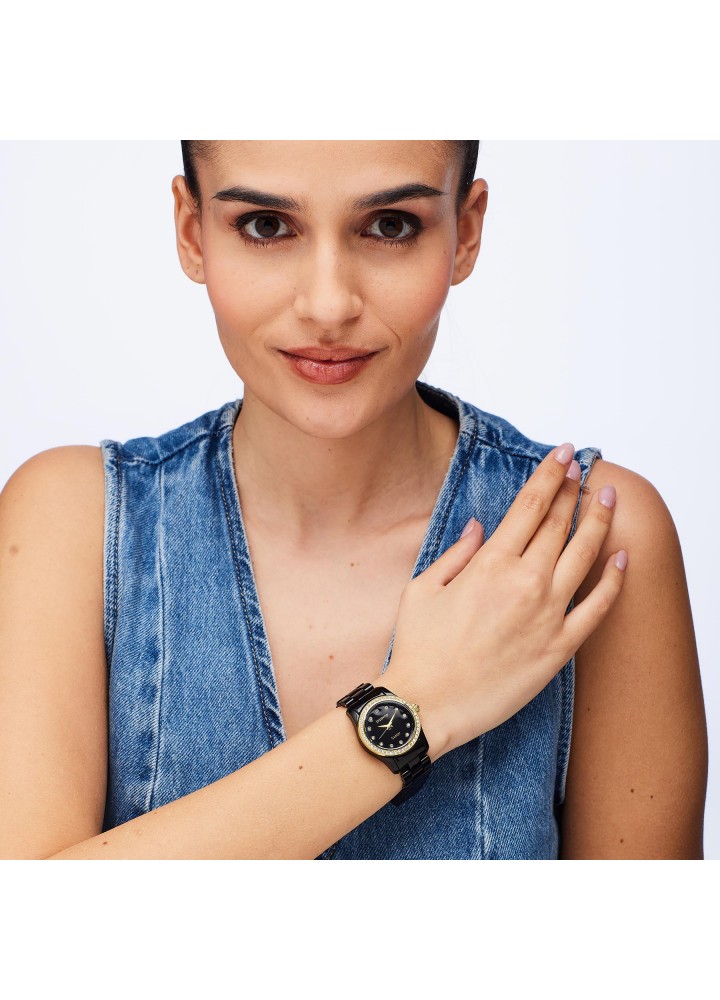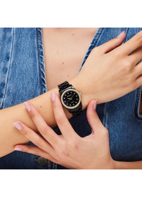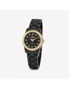 Orologio solo tempo in acciaio 304 con quadrante copper nero e cristalli, finitura pvd oro 14K con cinturino in policarbonato nero.