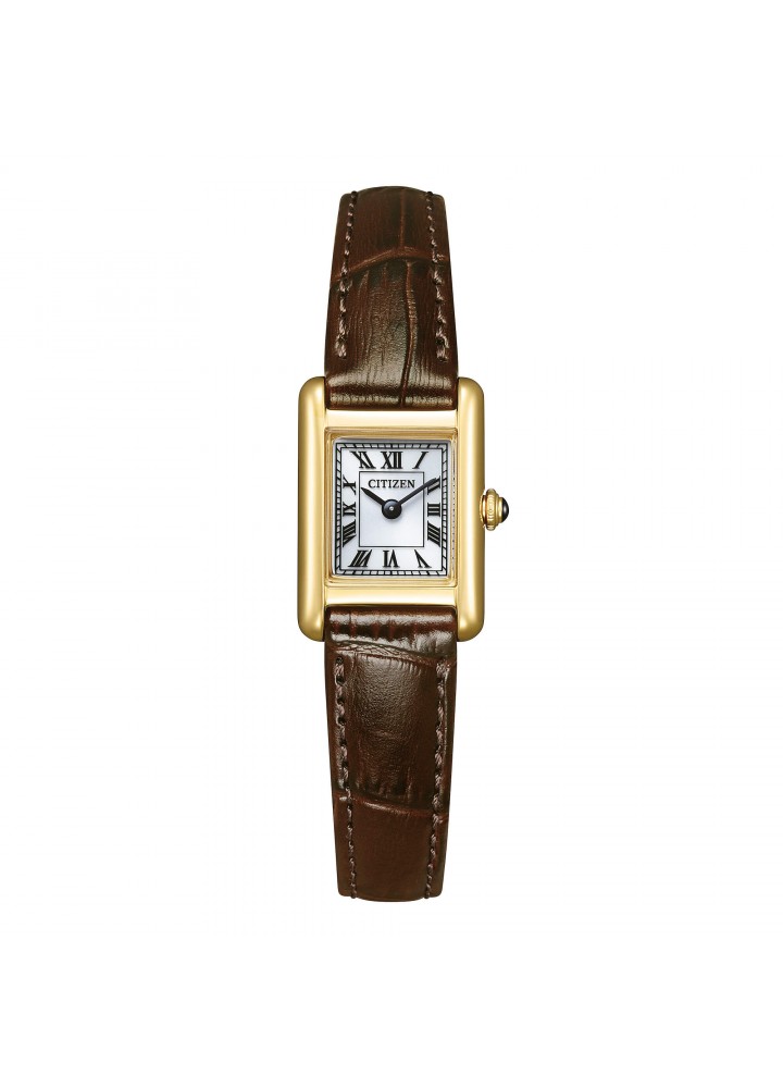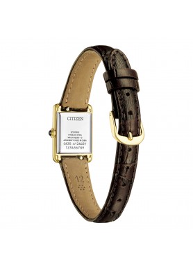 Il Citizen Lady EG2797-13A è un orologio da donna dal carattere elegante e senza tempo: cassa rettangolare in acciaio PVD oro giallo da 17,4×24,5mm, quadrante bianco con indici romani e cinturino in pelle marrone si combinano in un insieme raffinato e versatile. Il movimento solare Eco-Drive con calibro G620 garantisce una riserva di carica di circa 8 mesi al buio, liberando dall’obbligo di sostituire le pile. Sottile appena 5,4mm, questo segnatempo si indossa con naturalezza dalla mattina alla sera, su ogni occasione. Garanzia Citizen ufficiale 5 anni.